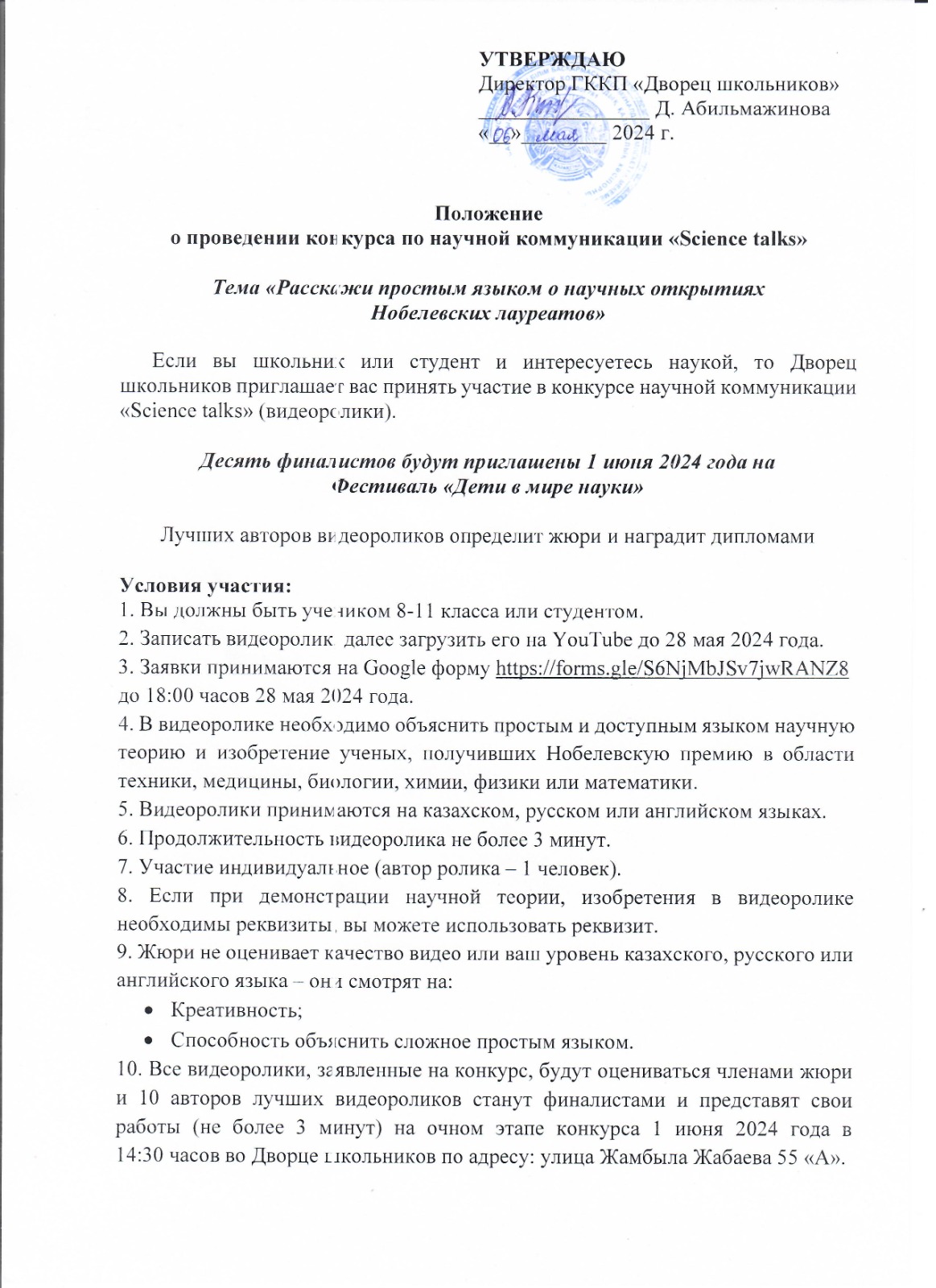 Заявки принимаются до 18:00 часов 28 мая 2024 года на Google форму. Справки по телефону +7 7152 34-02-44