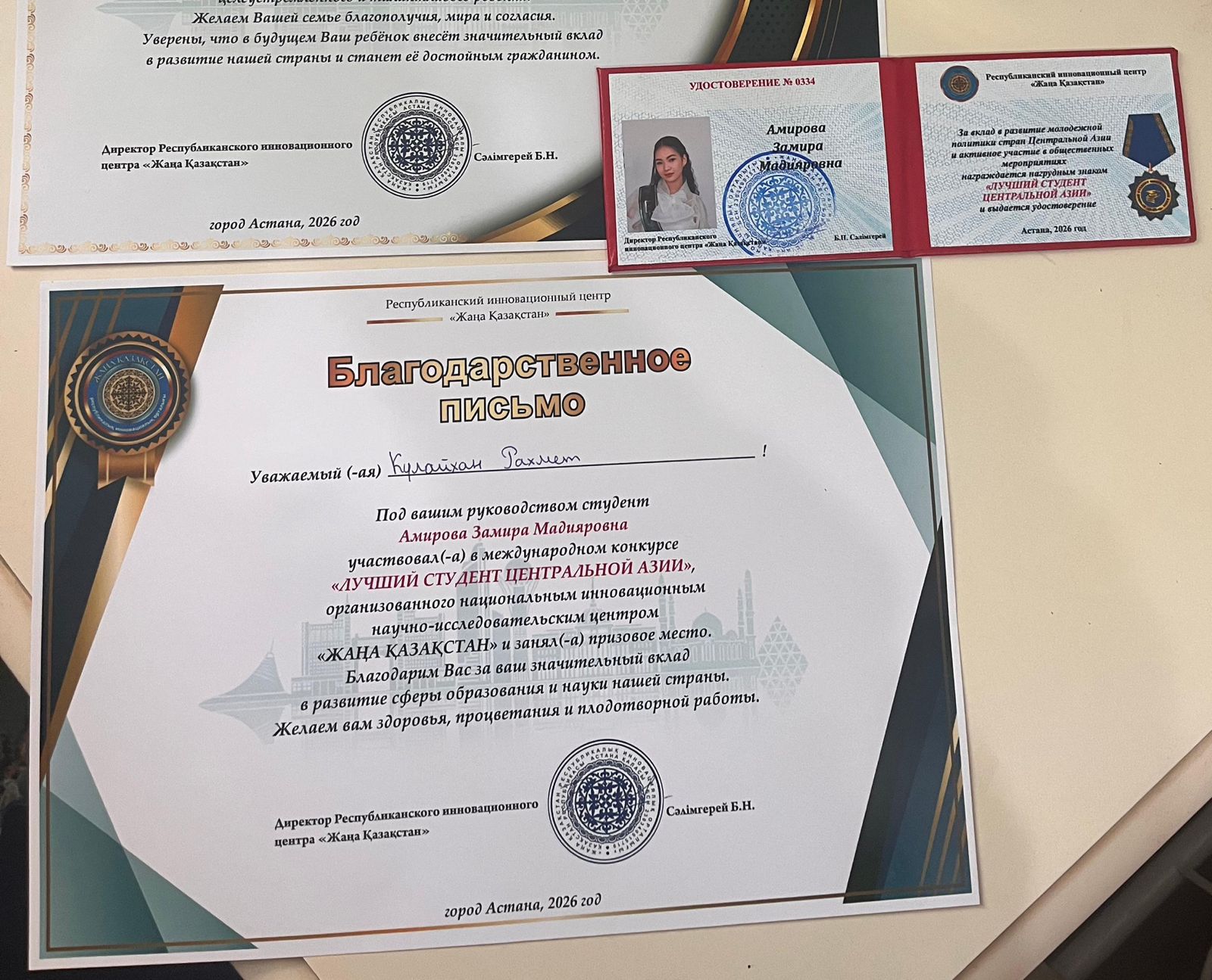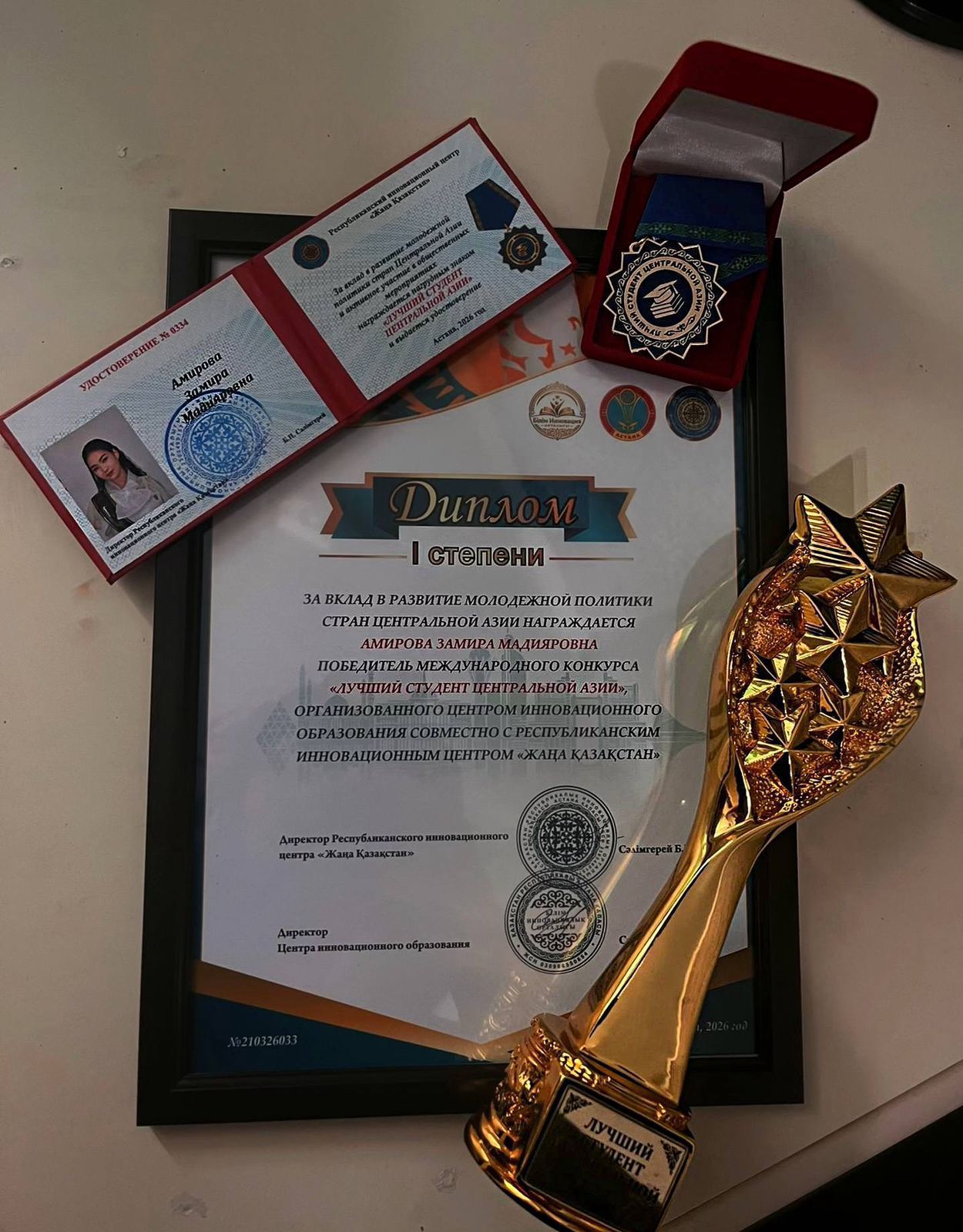 Амирова Замира Мадияровна байқау барысында өзінің терең білімін, жан-жақты дайындығын және жоғары деңгейдегі белсенділігін көрсетіп, қазылар алқасының жоғары бағасына ие болды. Нәтижесінде «Үздік Орталық Азия студенті» атағын иеленіп, І дәрежелі диплом және арнайы төсбелгімен марапатталды.